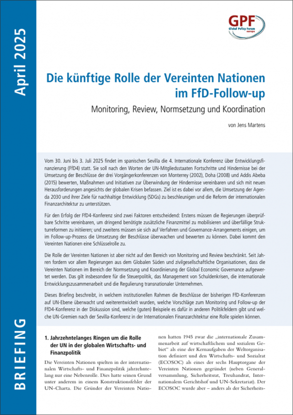 Die Rolle der Vereinten Nationen ist aber nicht auf den Bereich von Monitoring und Review beschränkt. Seit Jahren fordern vor allem Regierungen aus dem Globalen Süden und zivilgesellschaftliche Organisationen, dass die Vereinten Nationen im Bereich der Normsetzung und Koordinierung der Global Economic Governance aufgewertet werden. Das gilt insbesondere für die Steuerpolitik, das Management von Schuldenkrisen, die internationale Entwicklungszusammenarbeit und die Regulierung transnationaler Unternehmen.