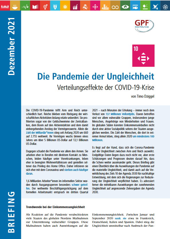 Es liegt auf der Hand, dass sich die Corona-Pandemie auf die Ungleichheit zwischen Arm und Reich auswirkt. Endgültige Daten liegen dazu noch nicht vor, aber erste Schätzungen und Prognosen deuten darauf hin, dass die Schere weiter auseinander geht. Dieses Briefing gibt einen Überblick über die Auswirkungen der Pandemie auf die materielle Ungleichheit, und damit auch auf die Verwirklichung des Ziels 10 der Agenda 2030 für nachhaltige Entwicklung, mit dem sich die Regierungen zur Reduzierung der Ungleichheit verpflichtet haben. Es adressiert ferner die mittelbaren Auswirkungen der zunehmenden Ungleichheit auf angrenzende Zielvorgaben der Agenda 2030.
