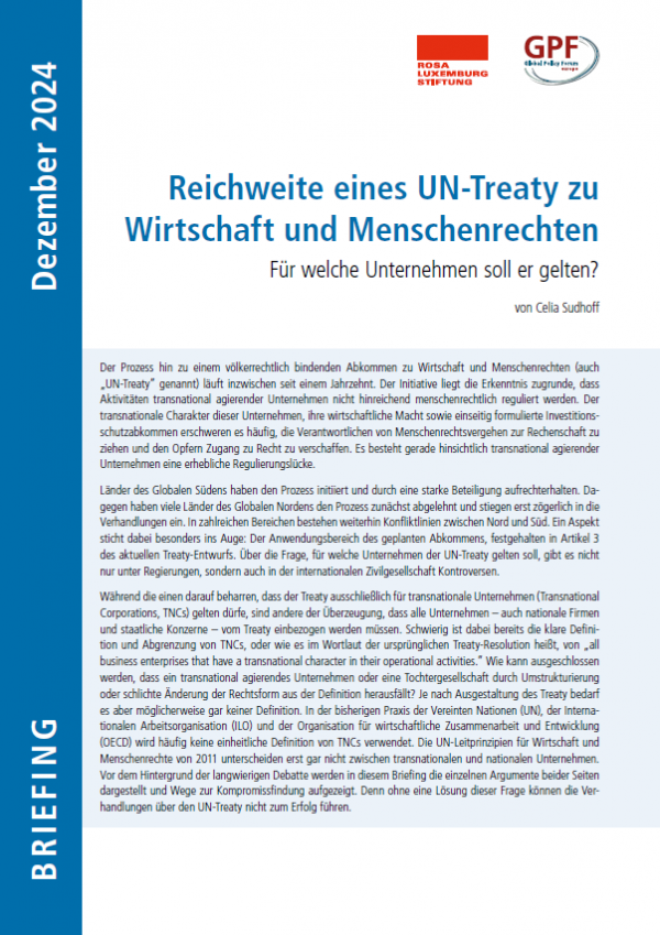 Während die einen darauf beharren, dass der Treaty ausschließlich für transnationale Unternehmen (Transnational Corporations, TNCs) gelten dürfe, sind andere der Überzeugung, dass alle Unternehmen – auch nationale Firmen und staatliche Konzerne – vom Treaty einbezogen werden müssen. Schwierig ist dabei bereits die klare Definition und Abgrenzung von TNCs, oder wie es im Wortlaut der ursprünglichen Treaty-Resolution heißt, von „all business enterprises that have a transnational character in their operational activities.“ Wie kann ausgeschlossen werden, dass ein transnational agierendes Unternehmen oder eine Tochtergesellschaft durch Umstrukturierung oder schlichte Änderung der Rechtsform aus der Definition herausfällt? Je nach Ausgestaltung des Treaty bedarf es aber möglicherweise gar keiner Definition. In der bisherigen Praxis der Vereinten Nationen (UN), der Internationalen Arbeitsorganisation (ILO) und der Organisation für wirtschaftliche Zusammenarbeit und Entwicklung (OECD) wird häufig keine einheitliche Definition von TNCs verwendet. Die UN-Leitprinzipien für Wirtschaft und Menschenrechte von 2011 unterscheiden erst gar nicht zwischen transnationalen und nationalen Unternehmen. Vor dem Hintergrund der langwierigen Debatte werden in diesem Briefing die einzelnen Argumente beider Seiten dargestellt und Wege zur Kompromissfindung aufgezeigt. Denn ohne eine Lösung dieser Frage können die Verhandlungen über den UN-Treaty nicht zum Erfolg führen.