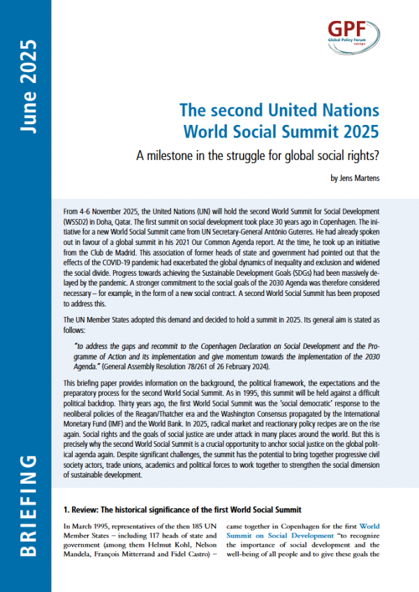 This briefing paper provides information on the background, the political framework, the expectations and the preparatory process for the second World Social Summit. As in 1995, this summit will be held against a difficult political backdrop. Thirty years ago, the first World Social Summit was the ‘social democratic’ response to the neoliberal policies of the Reagan/Thatcher era and the Washington Consensus propagated by the International Monetary Fund (IMF) and the World Bank. In 2025, radical market and reactionary policy recipes are on the rise again. Social rights and the goals of social justice are under attack in many places around the world. But this is precisely why the second World Social Summit is a crucial opportunity to anchor social justice on the global political agenda again. Despite significant challenges, the summit has the potential to bring together progressive civil society actors, trade unions, academics and political forces to work together to strengthen the social dimension of sustainable development.